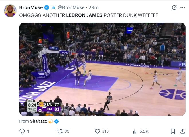 誰能想到上半場(chǎng)膝蓋被撞的勒布朗,下半場(chǎng)還能完成這樣的個(gè)人暴扣,還差11天就41歲的勒布朗還能飛這么遠(yuǎn),第三節(jié)老詹拿到4分3助攻1搶斷,三節(jié)打完已經(jīng)拿到18分7助攻3籃板只有1個(gè)失誤而已。